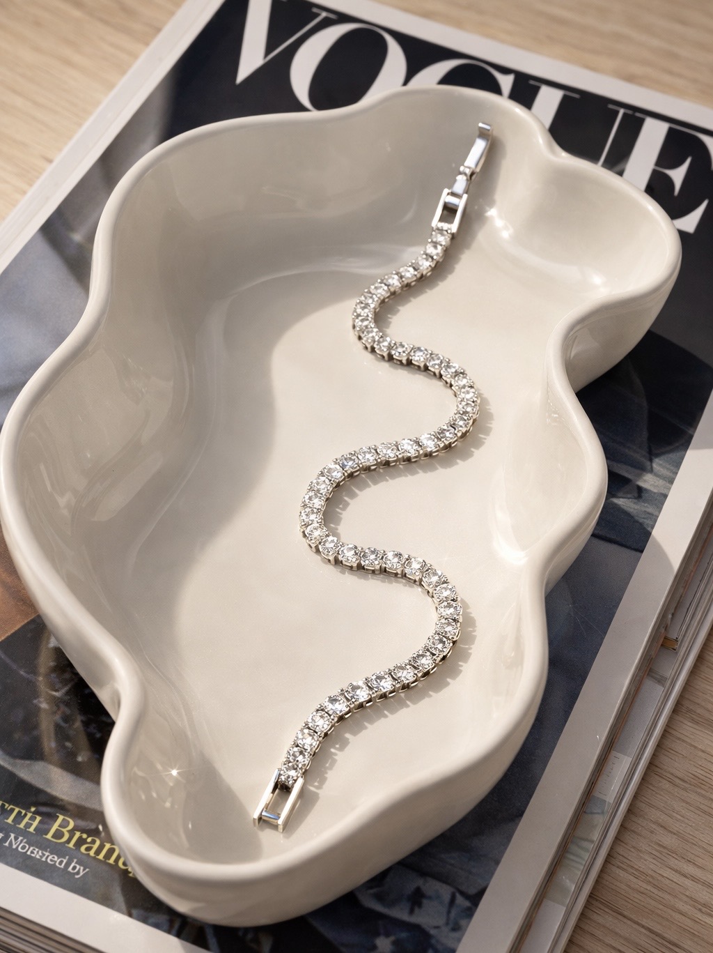 دستبند تنیسی/ جنس آبکاری نقره / ضدحساسیت / فری سایز /هرگونه بدلیجات از مواد شوینده عطر ادکلن استخر عرق اسیدی دور باشند / جنس آبکاری نقره میباشد و از تماس مستقیم با اکسیژن دور بماند / بعد از استفاده در باکس درب دار نگهداری شود